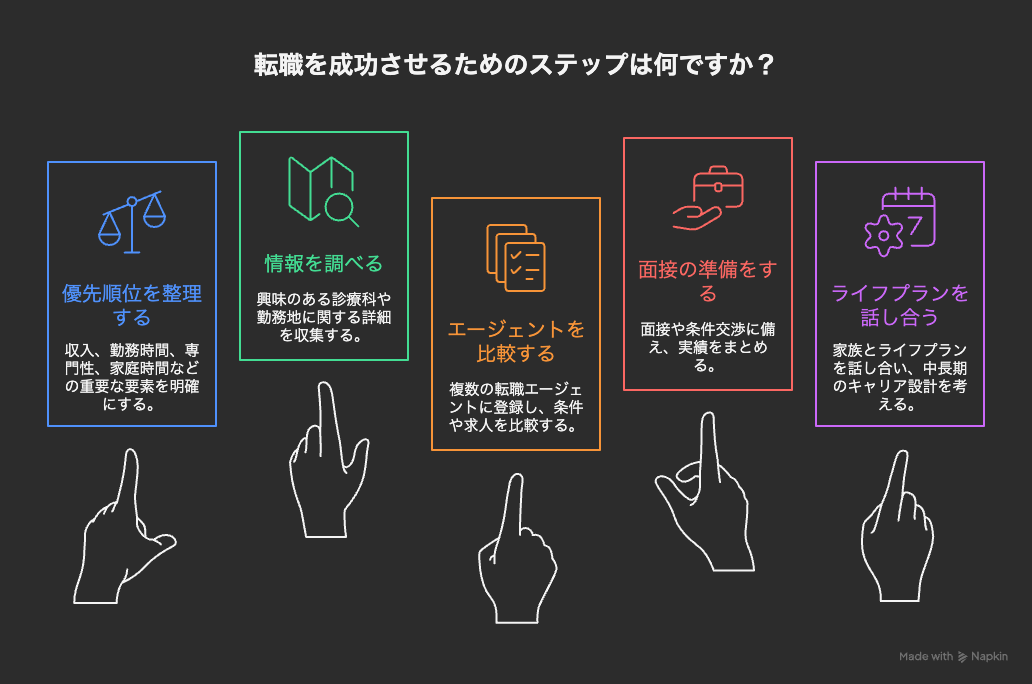 転職を成功させるには、自分の優先順位を明確にすることが欠かせません。収入、勤務時間、専門性、家庭との時間の中で何を重視するかを決めましょう。その後、求人サイトや転職エージェントを活用することで、非公開求人や条件交渉などの支援を受けられます。