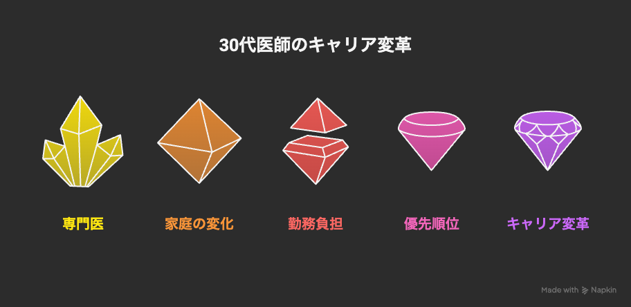 30代は専門医資格を取得し、一人前の医師として独り立ちする重要な時期です。同時に結婚や子育てなど家庭環境も大きく変化し、勤務負担と家庭生活の両立が課題となります。長時間勤務や当直が続けば家庭の時間が減り、転職を検討するきっかけになるケースが多いです。